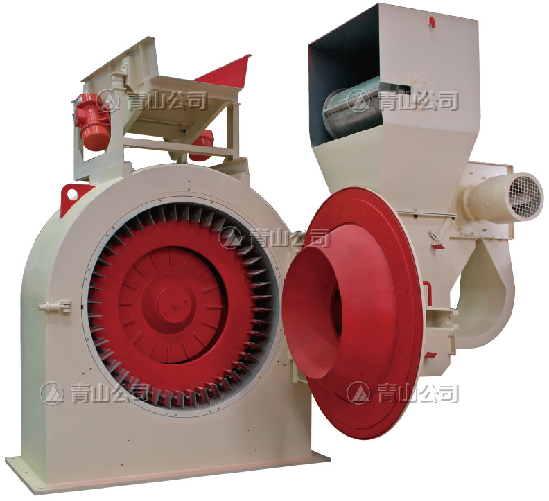 篩環式打磨機主要進料系統和打磨系統組成,前者主要由振動給料器、磁選滾筒、重物分離器組成;后者主要由機座、磨篩環、葉輪、主軸、驅動等組成。